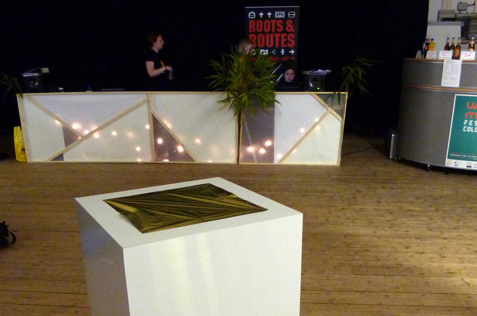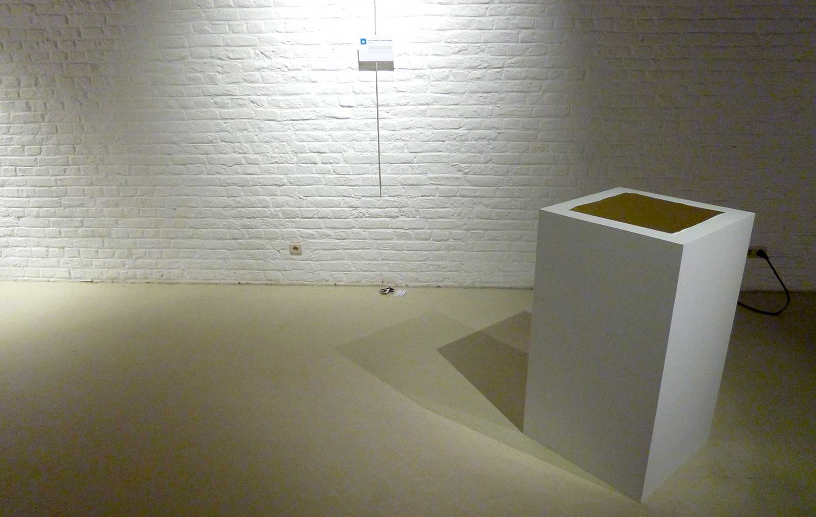 The heart of this object is an arduino board, which works with the data of a capacitive sensor and controls four servos. The capacitive sensor is a small piece of alu foil placed under the top plate of the white stele and is connected through some capacitors and resistors to the arduino. The four servos move four wheels to pull and push invisible threads, which are connected to the golden foil on the top. The result is an inverted parallel movement of two opposite points of the foil, eight points in total. The stele is 55 cm x 55 cm x 100 cm and needs just one energy plug. A light spot will complete the setting.