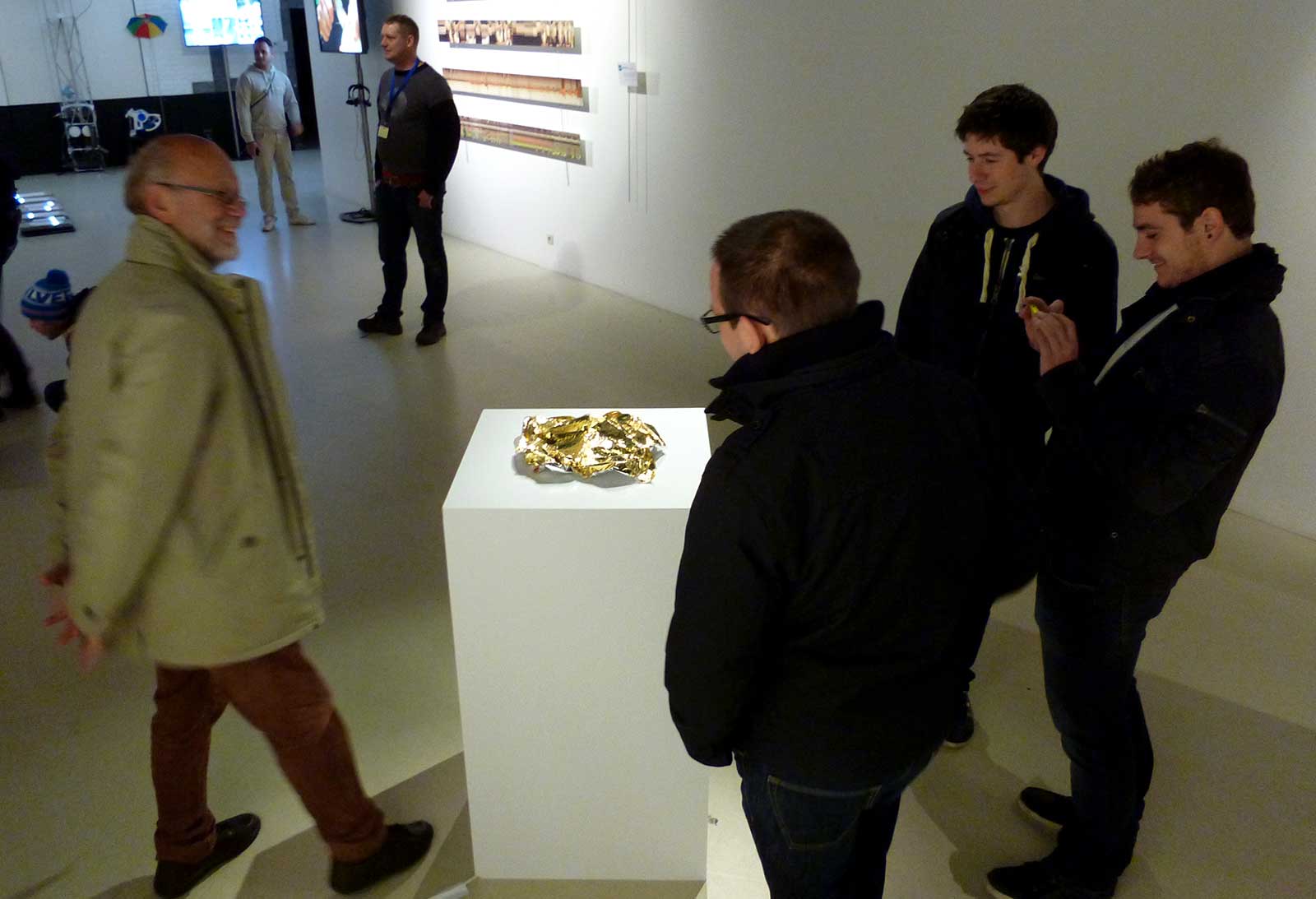 This machine and its alteration of shape and structure to react on interaction has to be as simple and abstract as possible. So we decided to use just a metaphor of a machine, its surface, a two dimensional object. We use a metal coated foil, which crinkle strongly and results abstract, interesting and inorganic random structures. Simple motion patterns emphasize the abstraction. The golden color of the foil gains extra attention. The final result simulates a living object with feelings, action and reaction. The users treat it in many different ways and we could observe a broad spectrum of their reactions: cute thing, different kinds of an animal, ugly, frightened, strange, confusing, has to take care of it and sometimes the question: what does the reaction of the foil say about me, about my interaction with it, about my character and condition?